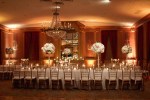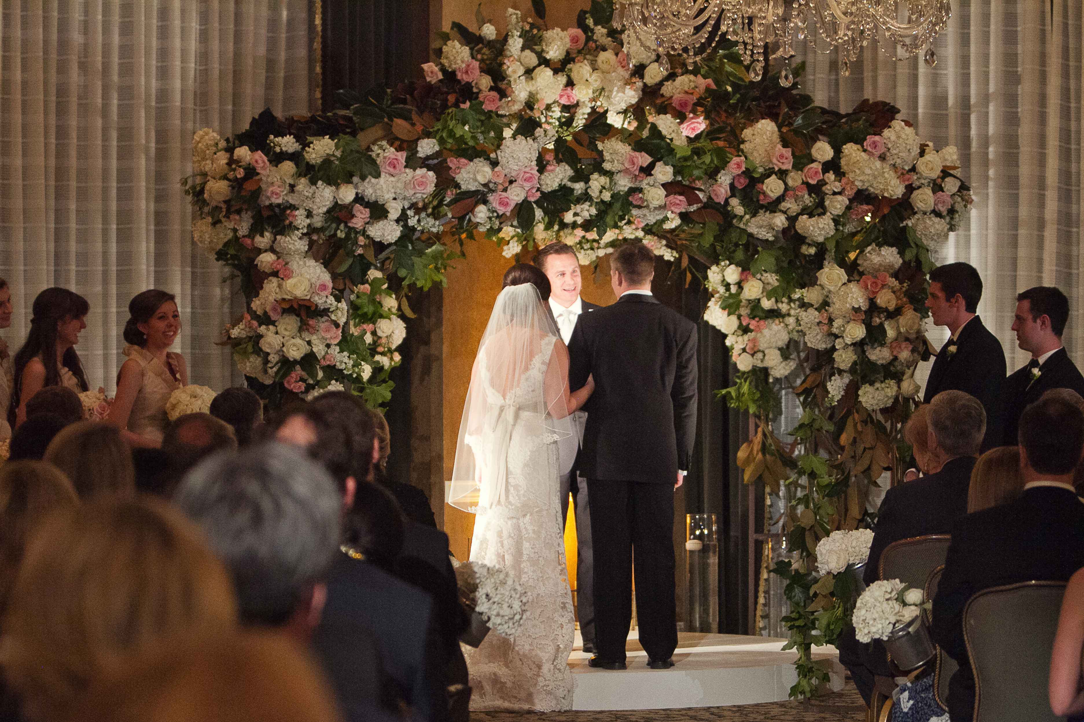 We maxed out the Top of the Town ballroom with 250 chairs, but still had room for their gorgeous floral arbor and wedding party at the front of the room.