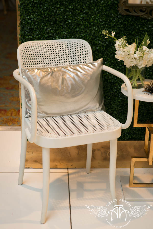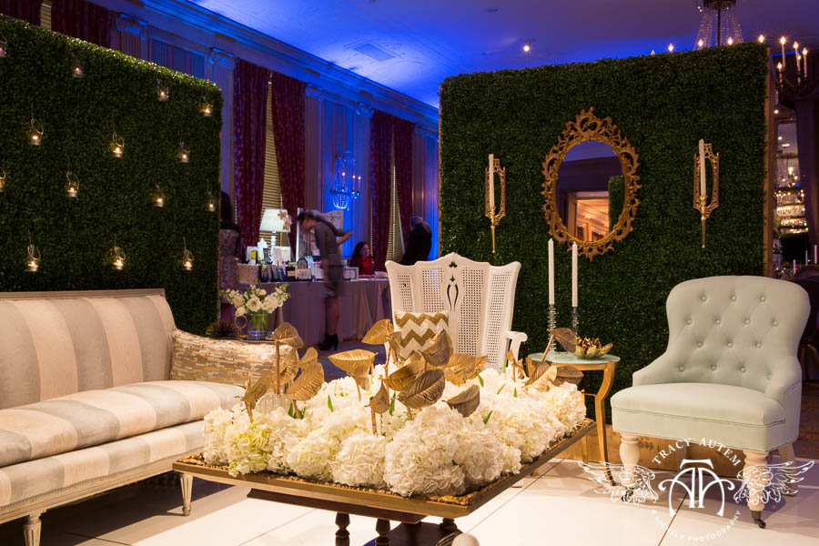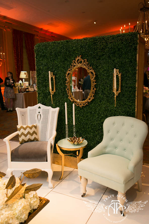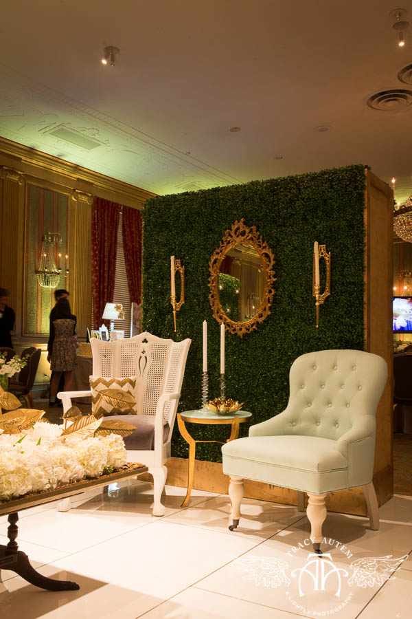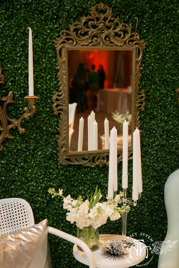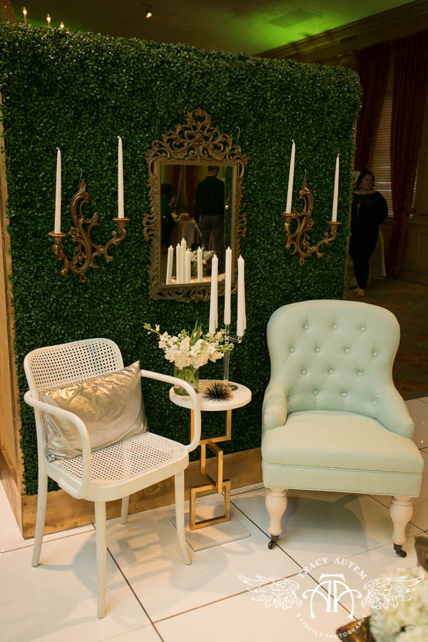 Using tall hedge walls from Propmaker Event Rentals, and a white dance floor from May I Serve U, the ladies created their semi-private lounge space in the middle of the larger ballroom. Furniture and decor details were added to make the space feel intimate and defined.