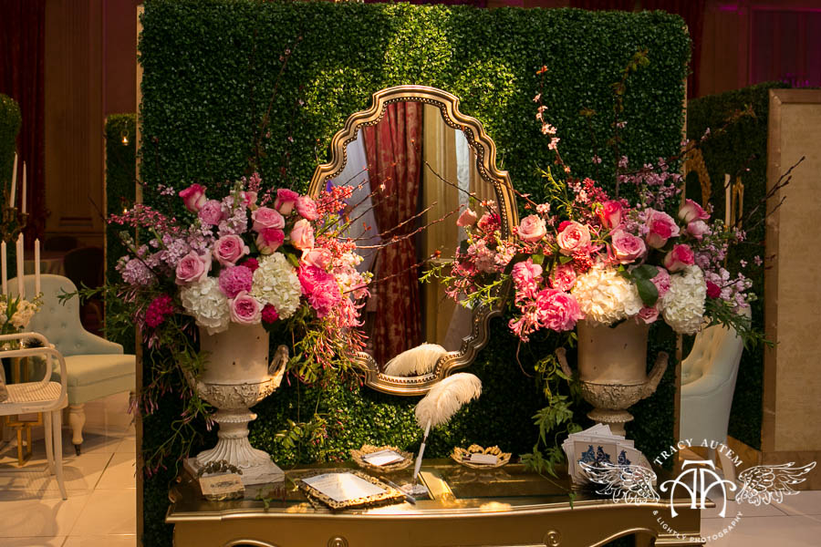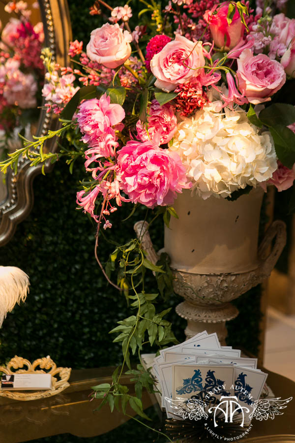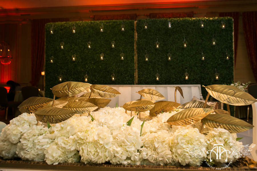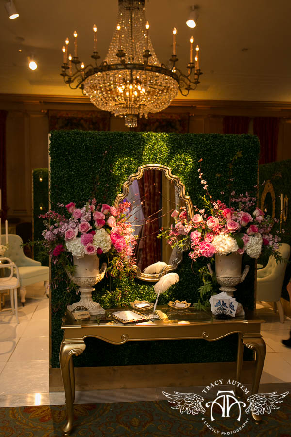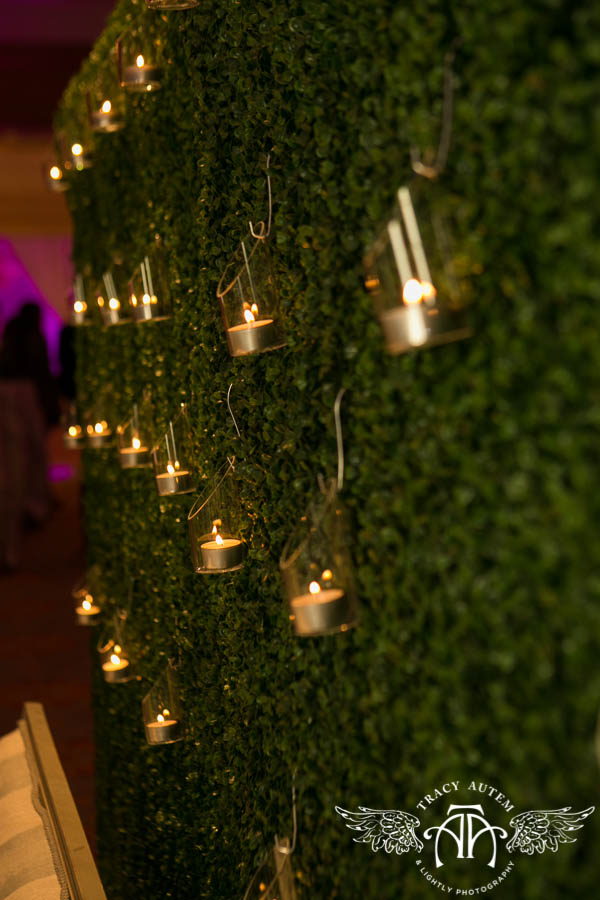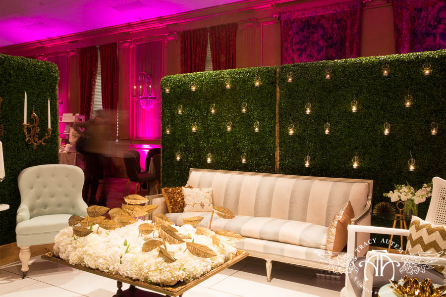 Using tall hedge walls from Propmaker Event Rentals, and a white dance floor from May I Serve U, the ladies created their semi-private lounge space in the middle of the larger ballroom. Furniture and decor details were added to make the space feel intimate and defined.