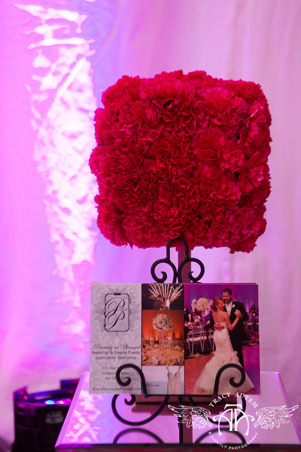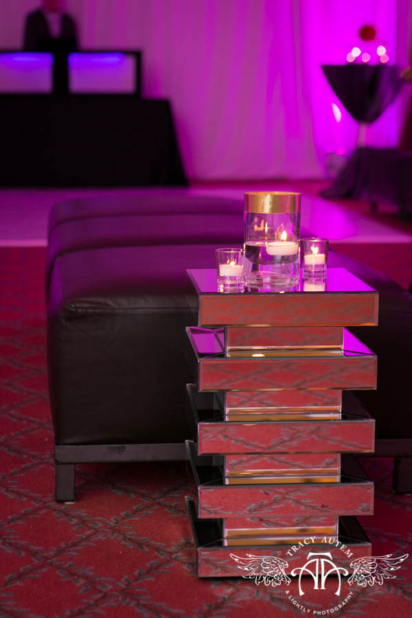 White draping from M&M Special Event Company created a blank canvas for Rhonda to do her magic and bring the space to life. She chose to use M&M’s black mod furniture, white dance floor, and mirrored pedestals to create a swank lounge space that everyone loved. Add the talents of DJ Rod Baker with DFW Parties, and this room was filled with music and dancing all night long.