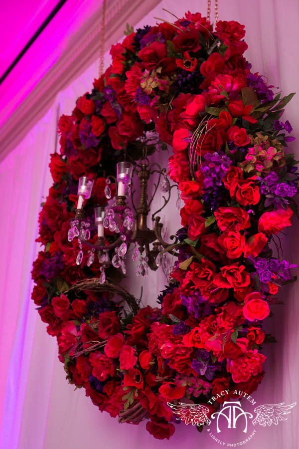Impressive floral wreaths created dramatic focal points on the main wall, and were accented by smaller arrangements on the cocktail and end tables. The whole look was pulled together with lighting and a unified color scheme of black, white and red.