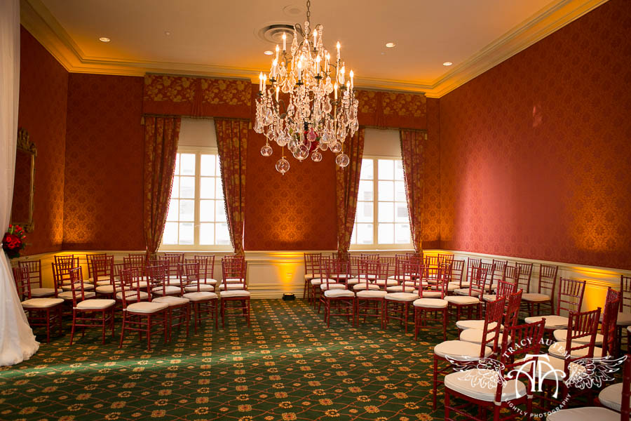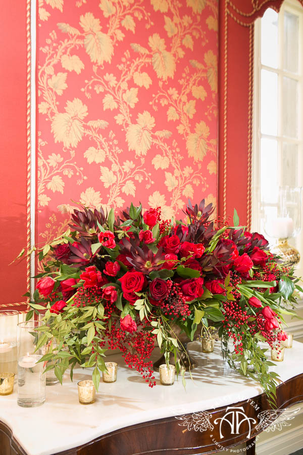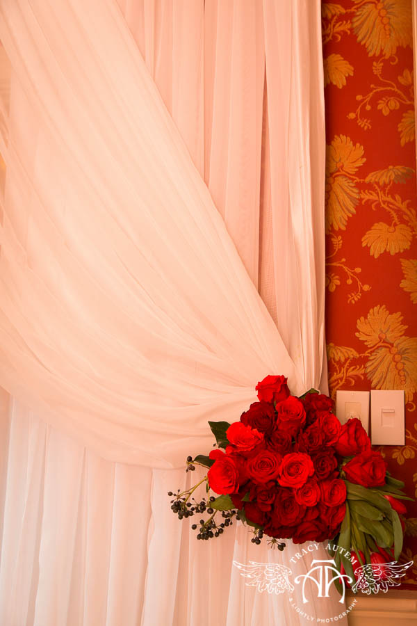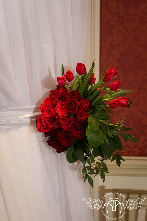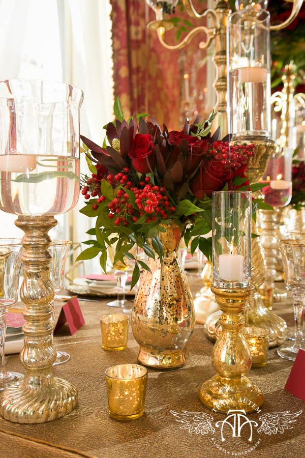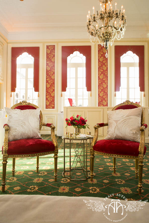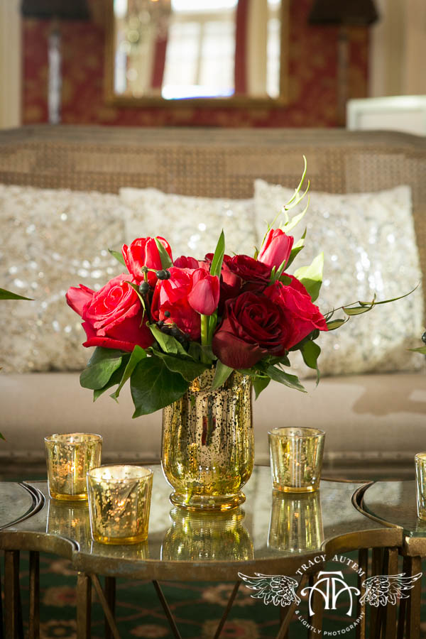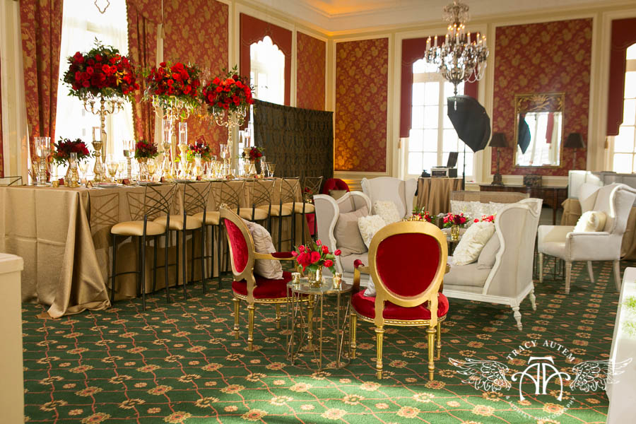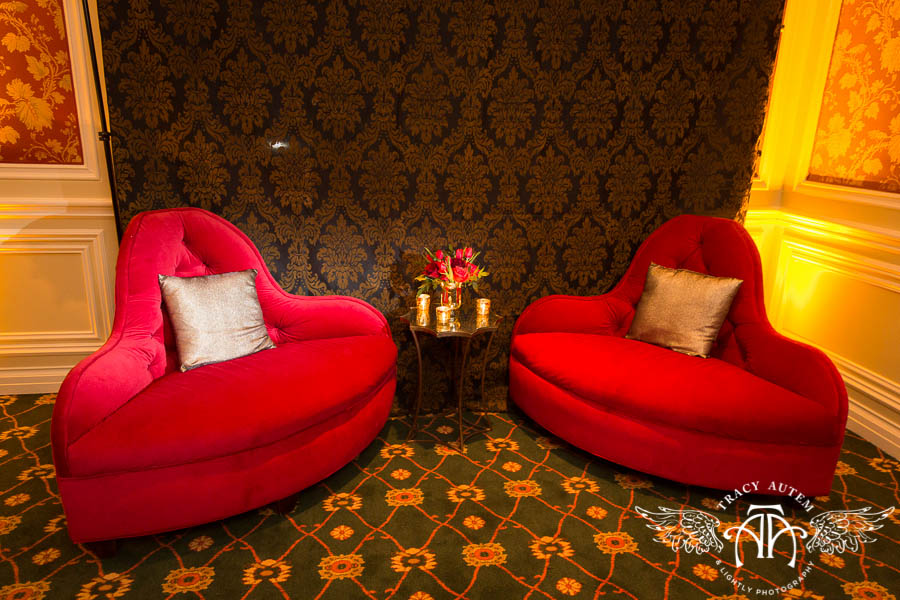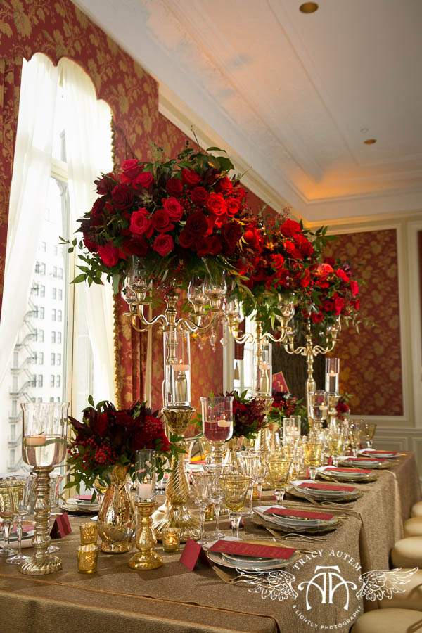 Our newly renovated Camellia Rooms are the perfect space for a romantic dinner or special event. Tucked in a corner of the 12th floor, these two small rooms can be joined together for an intimate ceremony and reception with close family and friends. Sarabeth Events designed both rooms at our recent Wedding & Special Event Showcase, and really showed off the reds and golds of the room with perfect accents of floral, decor, and furniture. (All photos by Tracy Autem Photography)