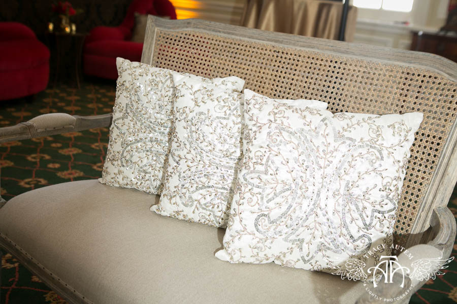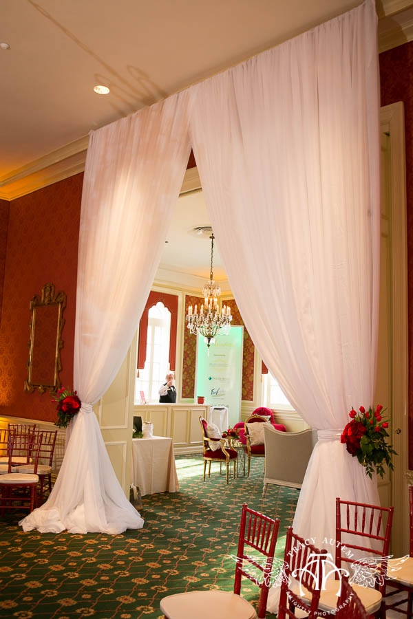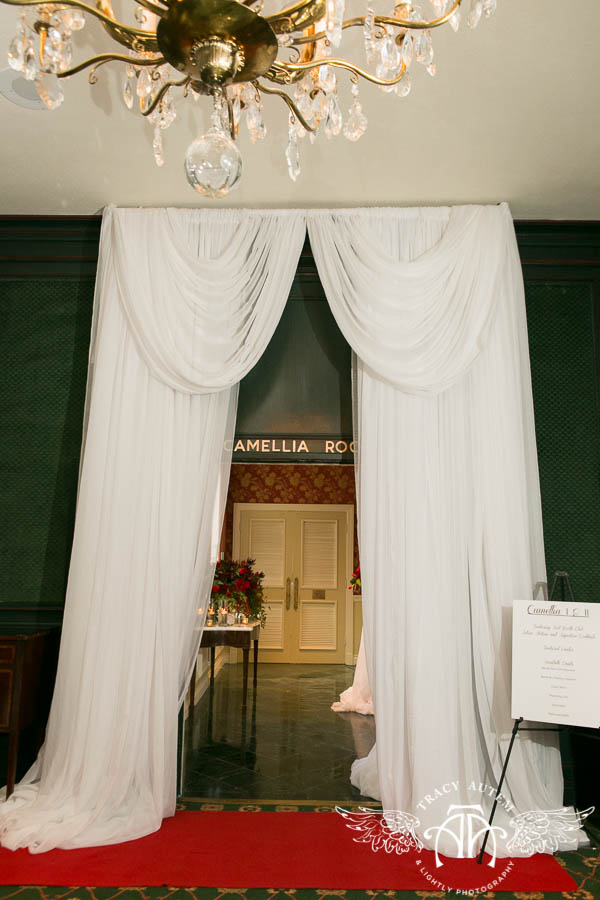 Elegant white draping by Randy Ro Entertainment created a dramatic entrance to the Camellia rooms from the lobby, and provided a transition between the ceremony and reception spaces as well. Additional furniture rentals from Fauxcades were used in the lounge space and really brought together the whole look. Custom menus and place cards by Harts & Quills added the perfect small details to the table.