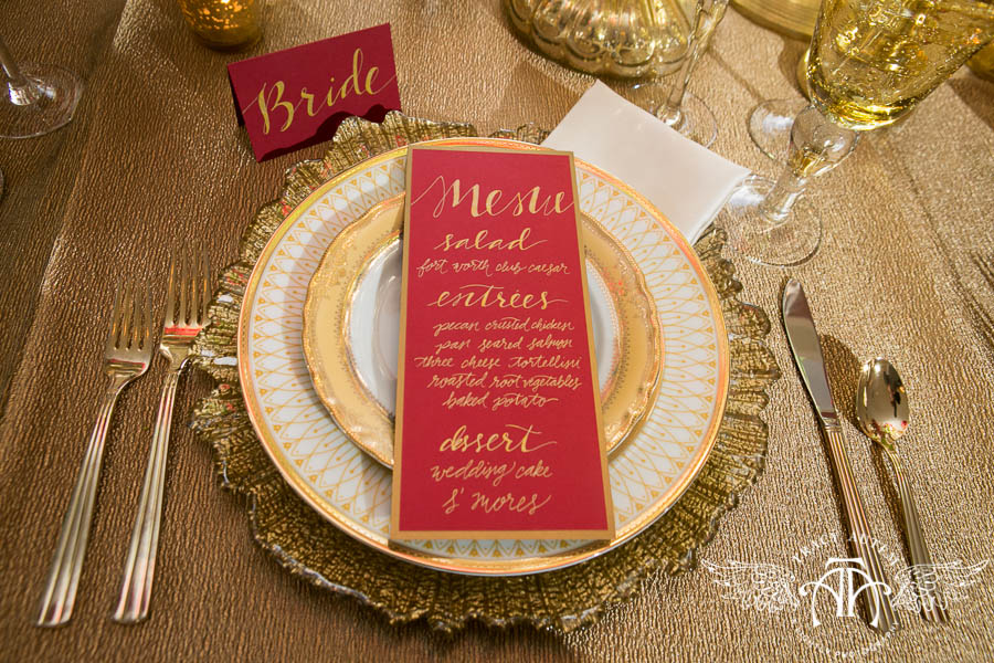 Taking on both rooms was no small feat for Sarabeth Events, but they executed it perfectly by showcasing an intimate ceremony set up in the round in one room and a fun lounge reception space in the adjoining room. Using rentals from Ducky Bob’s Classic Party Rental, including the red chivari chairs and fanfare barstools, and amazing floral by Branching Out Floral and Event Design, their vision of red and gold came together seamlessly.