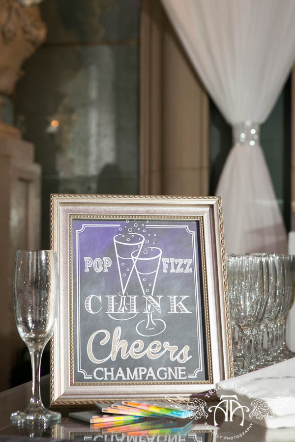 The “Bubbly Bar” is a custom upgrade drink station offered to our brides and clients. This bar includes several fresh squeezed juices, sparkling wines, and assorted fruit toppings. Signage provided by Paper Planet added a cute description of the options.